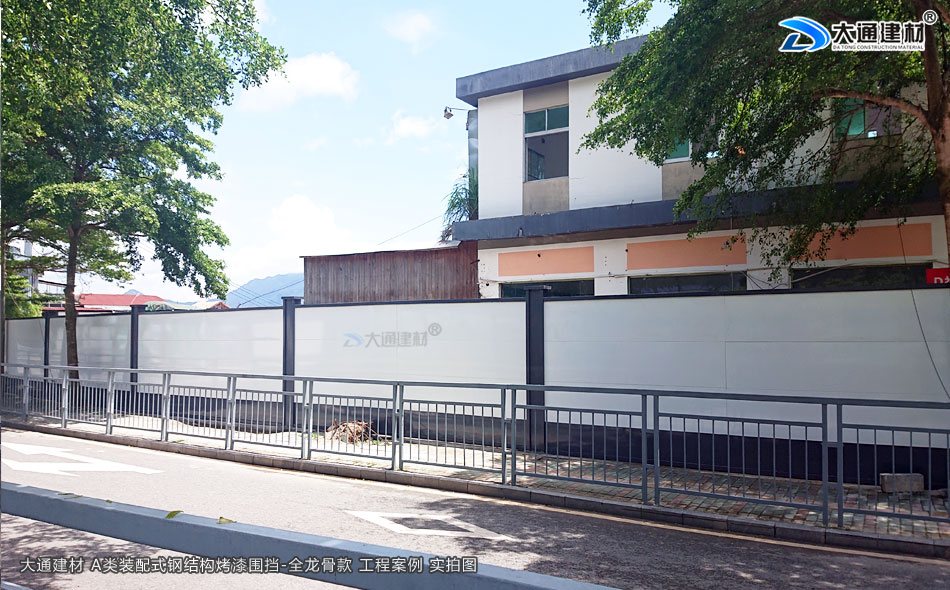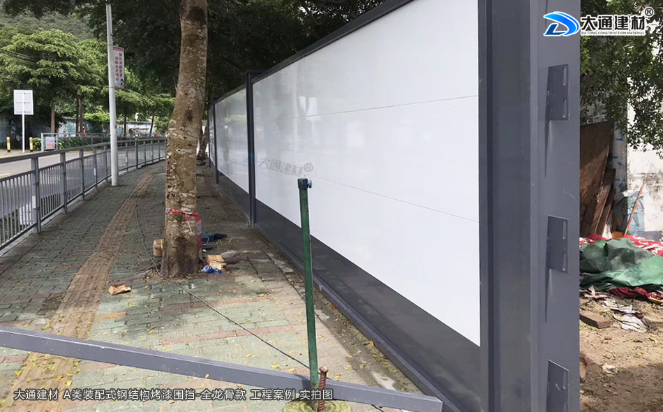 深圳市大通建材裝配式鋼圍擋全龍骨A款 采用裝配式+鋼結構+全龍骨 烤漆鋼板構造 安全穩固 抗風力強 美觀環保 經久耐用,應用于廣東省深圳市大鵬新區楊梅坑改造項目工程中,以下展示的圍擋圖片是大通建材裝配式鋼圍擋全龍骨A款在該項目部分位置的實拍圖