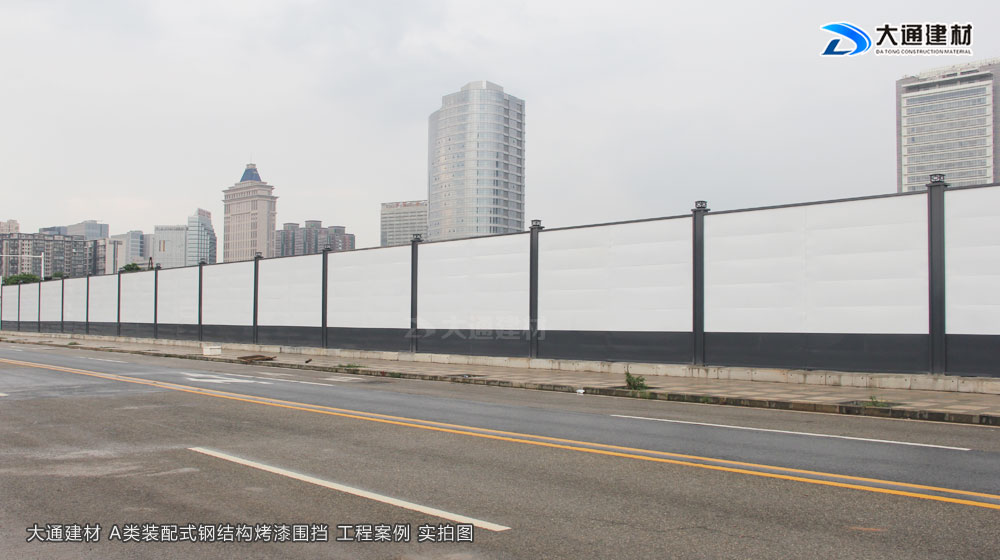 深圳市大通建材有限公司在東莞設(shè)有大型圍擋生產(chǎn)基地,是專業(yè)生產(chǎn)東莞市政標準圍擋的廠家,大通建材施工圍擋A款采用鋼結(jié)構(gòu)框架式結(jié)構(gòu),立柱采用國標型鋼,圍擋板采用1.2mm厚 的白色+灰色烤漆鋼板拼裝。圍擋核心受力關(guān)鍵點由立柱、斜支撐、橫撐加強筋共同組成,三重受力,預(yù)防圍擋傾倒,通過受力模型計算,抗風等級≤10級,抗剪強度、抗彎強度、穩(wěn)定性更強,已應(yīng)用于東莞茶山鎮(zhèn)施工項目。