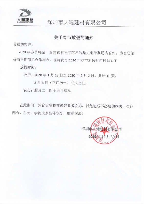 本文關鍵詞: 深圳大通建材有限公司,2020放假通知,圍擋生產廠家