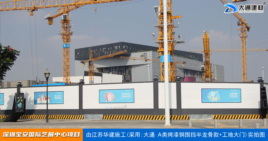 建設工程施工工地四周應按規定設置連續、密閉的鋼結構施工圍擋,建造多層、高層建筑的還應設置安全防護設施。在市區主要路段和市容景觀道路及市場、機場、碼頭、車站廣場等人流量、車流量比較多的地方設置的施工圍擋的高度不得低于2.5m,在其它路段設置的圍擋的高度不得低于1.8m。而深圳市大通建材A類鋼圍擋烤漆半/無龍骨款的標準高度是2.5米、長度為6.3米一擋,而圍擋高度特殊需求的如3/米/4/米/5米/6/米等高度的可以進行定制化生產。