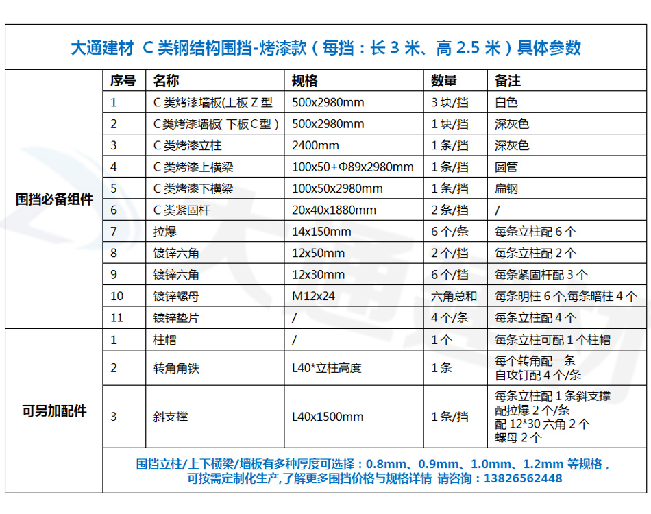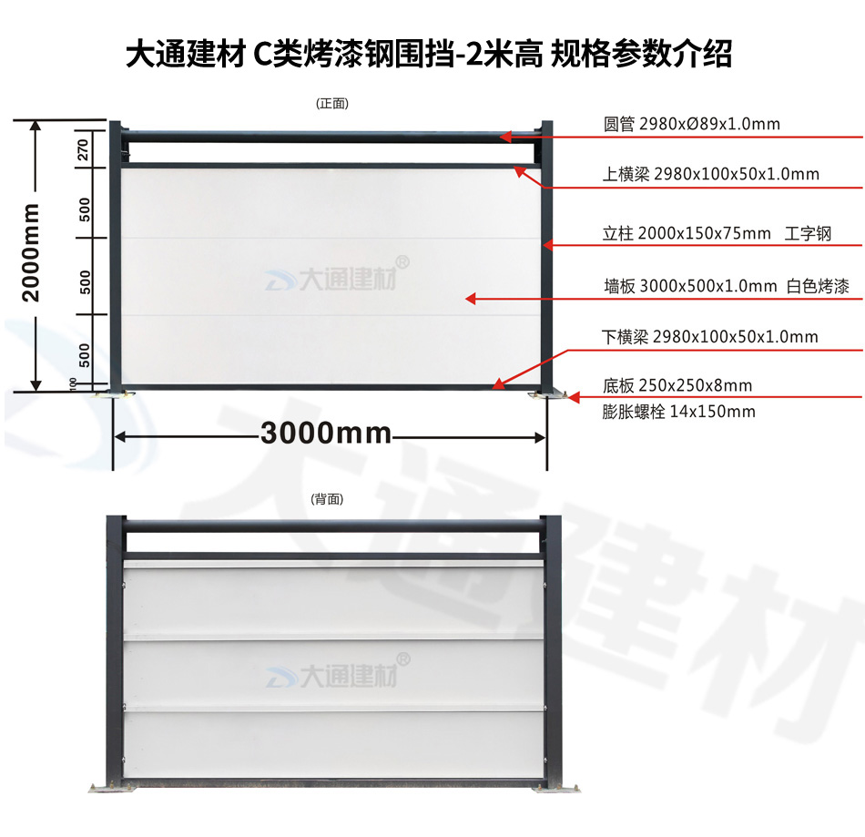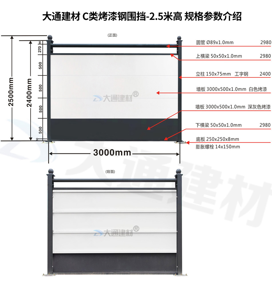 大通建材 C類裝配式鋼圍擋-烤漆款的烤漆鋼板厚度是1.0mm,采用150*75mm工字鋼深灰色烤漆立柱,同時每一擋圍擋的長度是3m,高度是2.5m,其它具體參數規格請參照上述展示的圍擋參數圖。